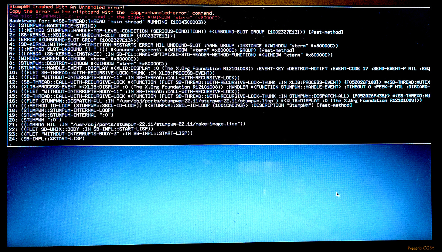 Leapin’ lizards! Just because I’m prolific at generating error messages doesn’t mean I can make heads or tails of them. All I know is that with a stream of threatening text like that, and no alternative but to do a hard reboot, something was definitely off. (I don’t know if this is a bug on any project’s part, or if sbcl simply isn’t meant to be invoked like this for some reason that is way beyond your humble Chair-Keyboard Interface.)
